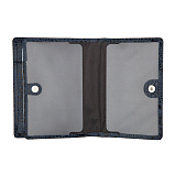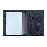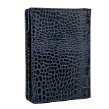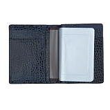 Обложка для автодокументов и паспорта из натуральной кожи синего цвета с тиснением под рептилию. Внутри пластиковый сменный блок прозрачных файлов для документов, семь кармашков для пластиковых карт, два потайных кармана, один угловой карман и отделение для паспорта на кнопке. Товар упакован в подарочную коробку от бренда Sergio Belotti. Размеры: 14 х 10,5 х 2 см.