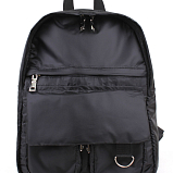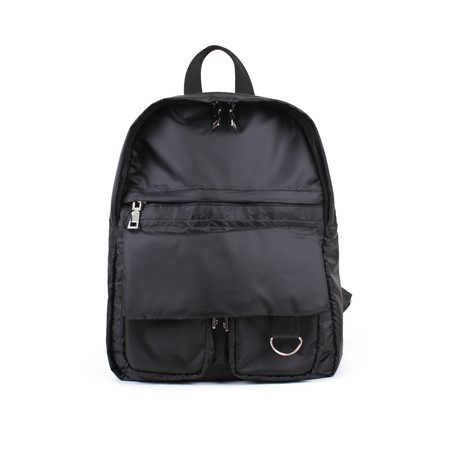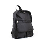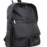 Легкий текстильный рюкзак формата А4. Одно отделение на молнии. На передней стенке два накладных кармана на молнии, сверху прикрытые от дождя клапаном, и глубокий плоский карман на молнии, которая также прикрыта декоративной накладкой. Внутри два открытых кармана и карман на молнии. Высота ручки 11 см.. Регулируемые наплечные ремни.
