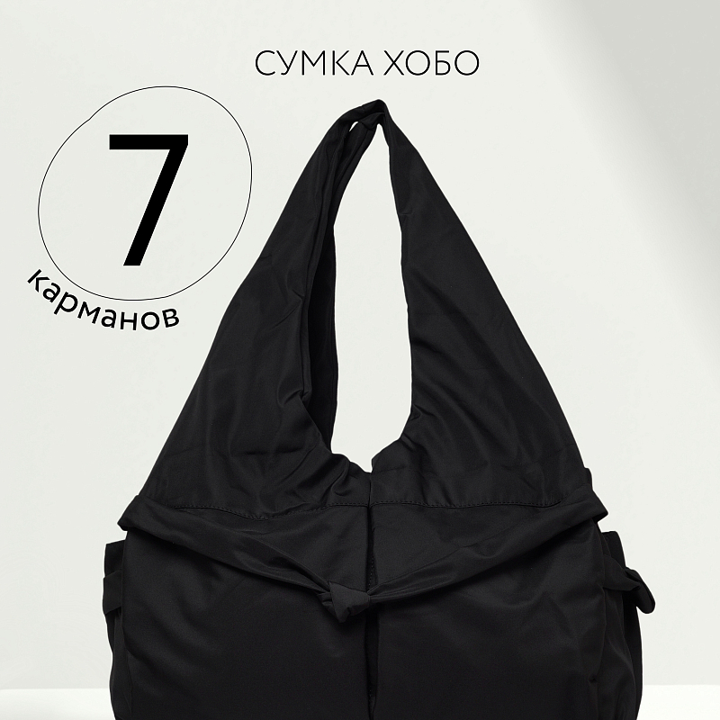 Объемная мягкая сумка с двойными ручками. Одно большое отделение на молнии, внутри дополнительный кармашек на молнии на задней стенке. Снаружи у ручек расположены кармашки на молнии (всего 4). Еще 2 кармашка на магнитных застежках находятся по бокам сумки. Высота мягких ручек - 30 см, Сумка украшена с трех сторон ремешками с декоративными узлами.