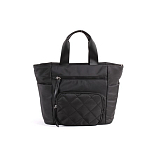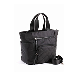 Текстильная женская сумка с одним отделением на молнии. На передней стенке - два кармана на молнии, по бокам - открытые карманы. Внутри - два отктырых кармана и карман на молнии. Две ручки высотой 14 см. Максимальная длиня съемного регулируемого ремня - 125 см.