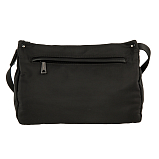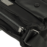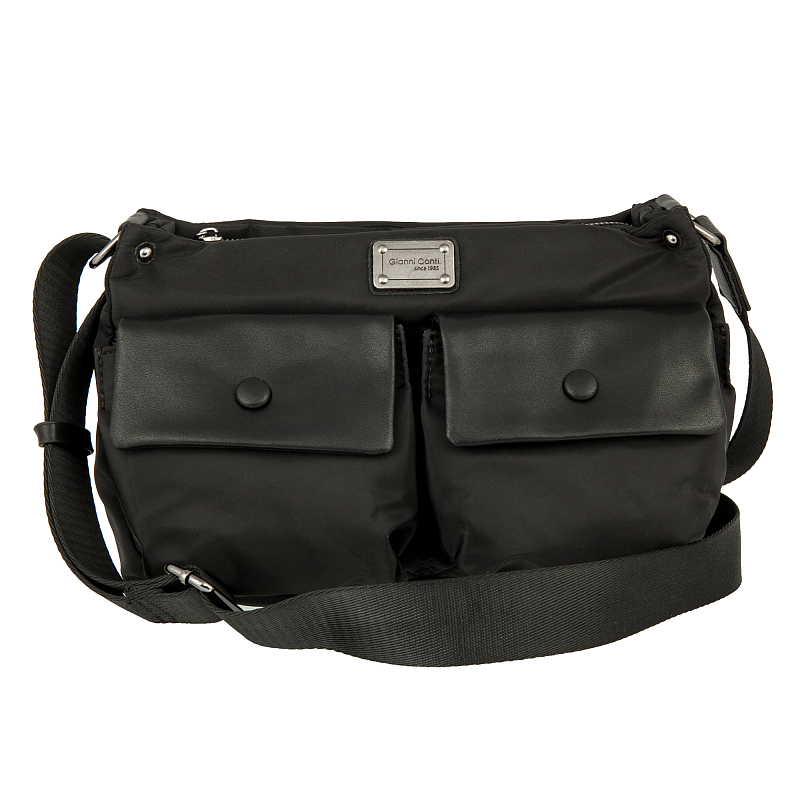 Женская комбинированная сумка из ткани и кожи черного цвета. Закрывается на молнию, внутри основного отделение, карман для документов на молнии, два отдела для мелких предметов. Снаружи на передней стенке два раздельных кармана, закрываются клапаном на магнитной кнопке, на задней стенке карман на молнии. Оснащена регулируемым плечевым ремнём.