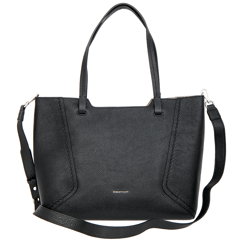Женская черная сумка Gianni Conti. Выполнена из натуральной мягкой кожи. Центральное отделение закрывается на молнию, по бокам два отдела. Внутри карман на молнии и кармашек для мелких предметов. Оснащена съемным, регулируемым, кожаным плечевым ремнём на карабинах, что позволяет носить сумку как на плече, так и через плечо.