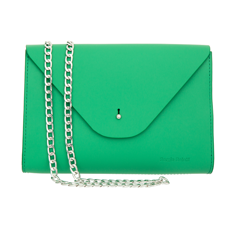 Женская зелёная сумка конверт от итальянского бренда Sergio Belotti. Выполнена из натуральной кожи. Закрывается клапаном на оригинальный замок. Внутри одно отделение. Оснащена съёмным ремешком-цепочкой на карабинах.