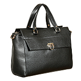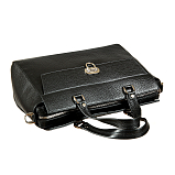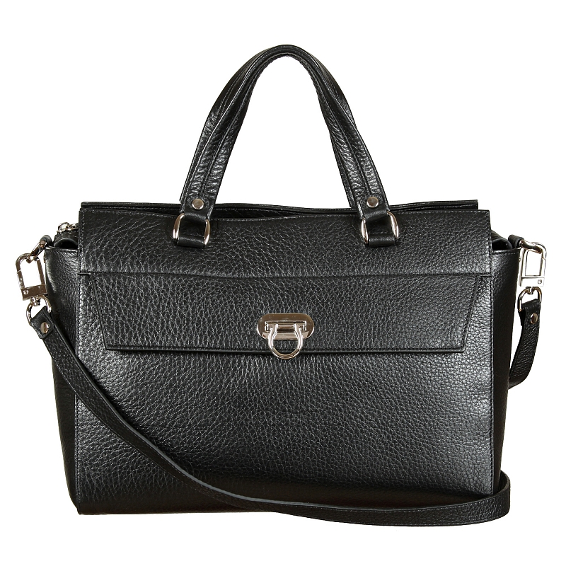 Классическая женская чёрная кожаная сумка от бренда Sergio Belotti. Закрывается на молнию. Внутри одно просторное отделение, карман на молнии и два открытых кармашка для мелких предметов. На лицевой стороне продольный карман с клапаном на замочке, на внутренней стороне карман на молнии. Оснащена двумя кожаными ручками и дополнительным съёмным регулируемым плечевым ремнём на карабинах. Цвет фурнитуры - серебро.