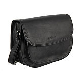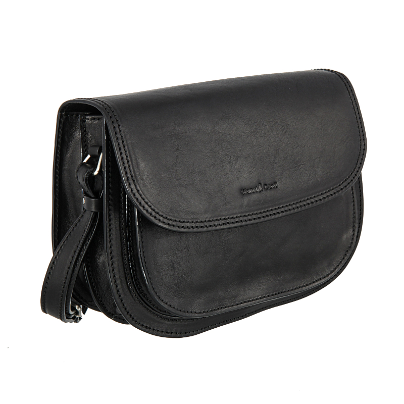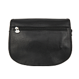 Женская сумка через плечо из натуральной кожи чёрного цвета. Внутри два основных отделения, одно из них на молнии, кармашек для телефона и карман для документов на молнии. На передней стенке накладной карман для мелких предметов, на задней стенке карман на молнии. Оснащена регулируемым плечевым ремнём.
