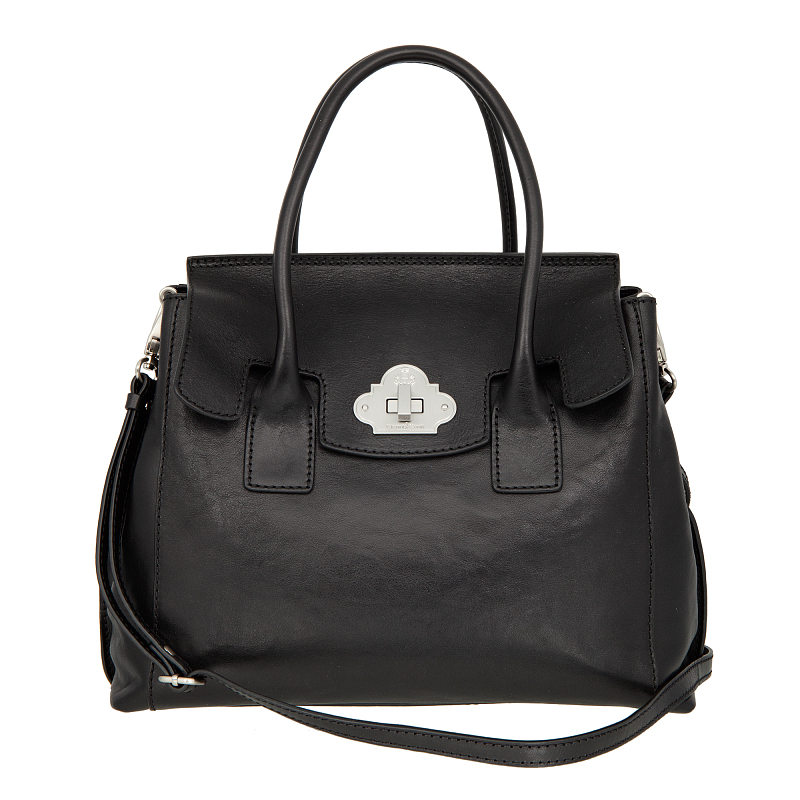 Женская сумка чёрного цвета от итальянского бренда Gianni Conti Bag. Кожа Vachetta - наилучшего качества, растительного дубления. Внутри два основных отделения, продольный карман на молнии и два открытых кармашка для мелких предметов. Закрывается клапаном на оригинальный замок. Оснащена двумя кожаными ручками и дополнительным съёмным регулируемым плечевым ремнём на карабинах, что позволяет носить сумку на плече или через плечо. Цвет фурнитуры - патинированная латунь. В комплекте фирменный мешок-пыльник.