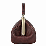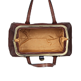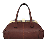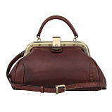 Оригинальная женская сумка-саквояж из натуральной кожи коричневого цвета. Внутри одно вместительное отделение, два кармашка для мелких предметов, держатель для авторучки, карман для документов на молнии. Закрывается на оригинальный замок. Оснащена съёмным регулируемым плечевым ремнём на карабинах.