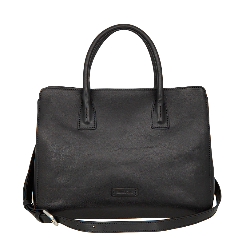 Классическая женская сумка чёрного цвета от итальянского бренда Gianni Conti Bag. Кожа Vachetta - наилучшего качества, растительного дубления. Сумка средних размеров, внутри два просторных отдела, два кармашка для мелких предметов, держатель для авторучки и карман для документов на молнии. Закрывается на молнию, оснащена двумя кожаными ручками и дополнительным кожаным регулируемым плечевым ремнём на карабинах, что позволяет носить сумку как на плече, так и через плечо. Цвет фурнитуры - серебро. В комплекте фирменный мешок-пыльник для бережного хранения.