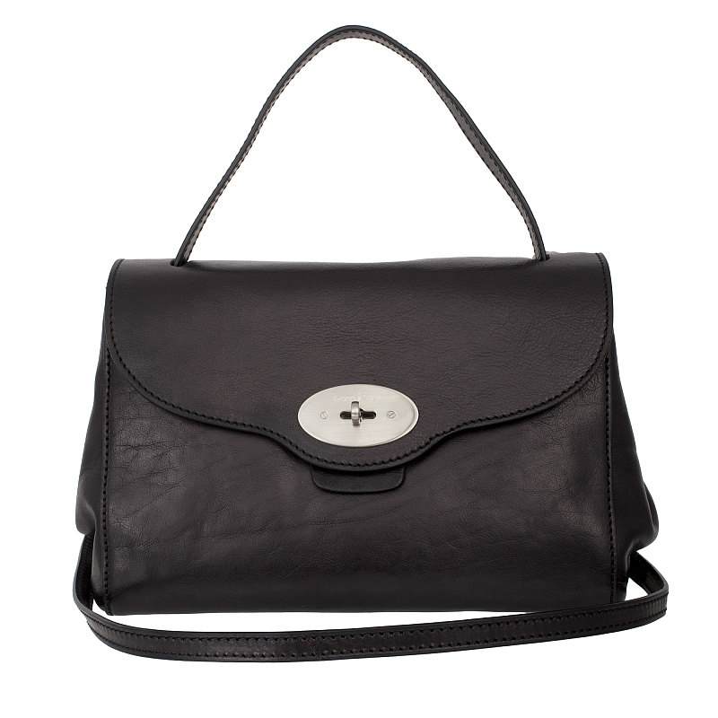 Сумка из натуральной кожи бренда Gianni Conti. Закрывается клапаном на оригинальный замок. Внутри отдел, в котором карман на молнии, два кармашка для мелких предметов, держатель для авторучки. На передней стенке под клапаном отдел на молнии. Снаружи на задней стенке карман на молнии. Оснащена съемным регулируемым плечевым ремнем на карабинах.