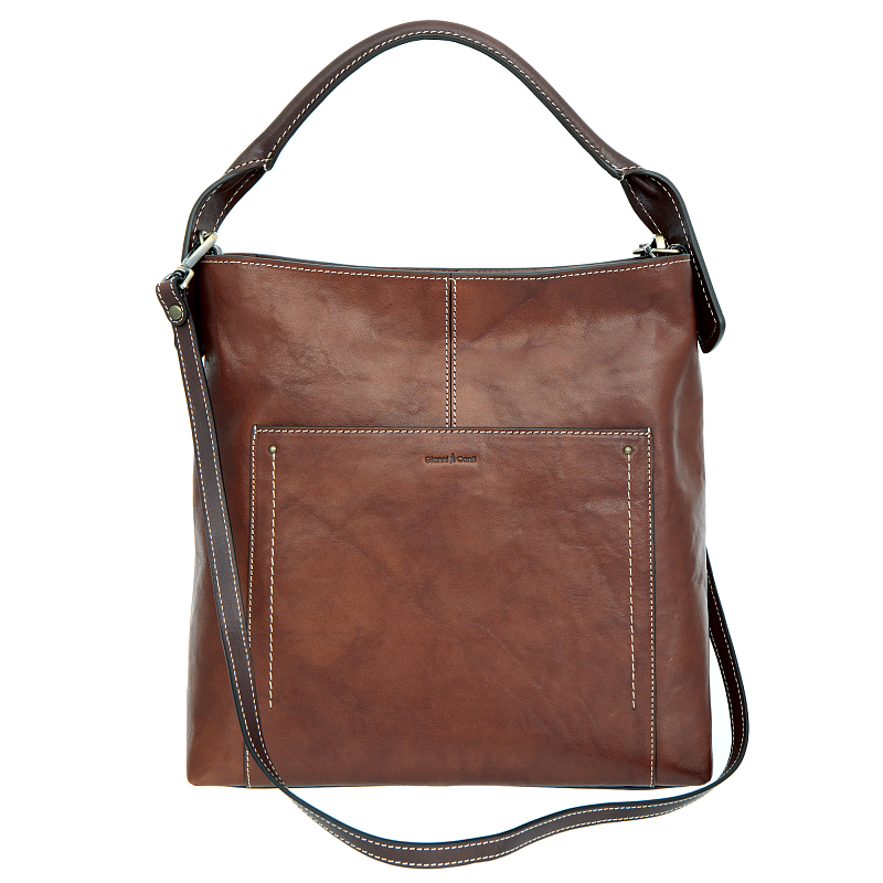 Коричневая женская кожаная сумка от итальянского бренда Gianni Conti. Кожа наилучшего качества, растительного дубления. Внутри одно основное отделение, карман на молнии, два открытых кармашка для мелких предметов и держатель для авторучки. Снаружи на лицевой стороне карман быстрого доступа на магнитной кнопке. Сумка закрывается на молнию, оснащена удлинённой кожаной ручкой и съёмным кожаным регулируемым плечевым ремнём на карабинах, благодаря чему сумку можно носить на плече или через плечо. Цвет фурнитуры - патинированная латунь. В комплекте мешок-пыльник для бережного хранения.