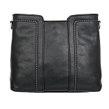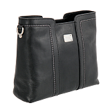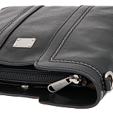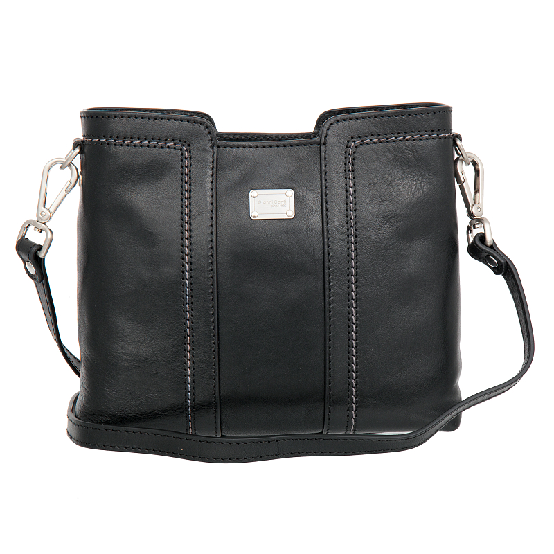 Женская чёрная кожаная сумка от итальянского бренда Gianni Conti. Состоит из трёх независимых отделений, основной отдел на молнии и два на магнитных кнопках. Внутри карман на молнии и открытый кармашек для мелких предметов. Оснащена съёмным кожаным регулируемым плечевым ремнём на карабинах, что позволяет носить сумку на плече или через плечо. В комплекте фирменный мешок-пыльник для бережного хранения.