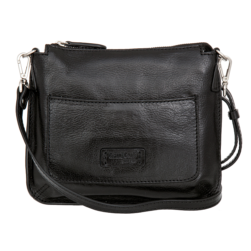 Женская чёрная сумка кросс-боди от итальянского бренда Gianni Conti. Выполнена из натуральной кожи естественной фактуры. Сумка закрывается на молнию, внутри одно основное отделение, карман на молнии, три кармана для мелких предметов и ручек. На лицевой стороне открытый карман быстрого доступа с тиснением бренда, на внутренней стороне карман на молнии. Оснащена кожаным регулируемым плечевым ремешком на карабинах. Вмещает документы формата А5. Цвет фурнитуры – серебро.