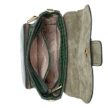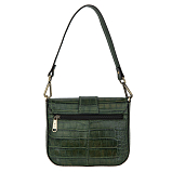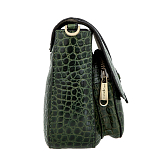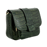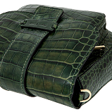 Миниатюрная зелёная кожаная сумка с тиснением под крокодила от итальянского бренда Gianni Conti. Кожа Vachetta наилучшего качества, растительного дубления. Внутри одно основное отделение, карман на молнии и открытый кармашек для мелких предметов. На лицевой стороне под клапаном накладной карман на молнии, на внутренней стороне карман на молнии. Оснащена удлинённой съёмной кожаной ручкой на карабинах и съёмным кожаным регулируемым плечевым ремнём на карабинах, благодаря чему сумку можно носить как на плече, так и через плечо. Цвет фурнитуры - патинированная латунь. В комплекте мешок-пыльник для бережного хранения. Размеры: 17 х 21 х 11 см.