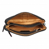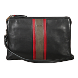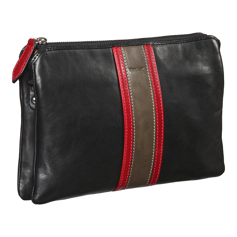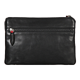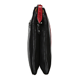 Женская сумка через плечо из натуральной кожи чёрного цвета. Внутри два основных отделения, карман для документов на молнии, восемь кармашков для пластиковых карт, два кармана для мелких предметов и держатель для авторучки. На задней стенке карман быстрого доступа на молнии. Оснащена съёмным регулируемым плечевым ремнём на карабинах. Украшена планкой из разноцветной кожи.