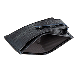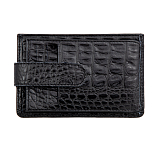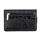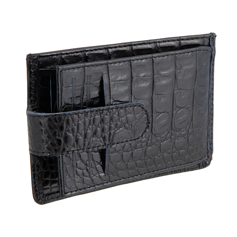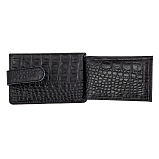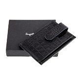 Компактная кредитница из натуральной кожи чёрного цвета с тиснением под рептилию. Внутри одно отделение для купюр, карман для монет на молнии и девять кармашков для пластиковых карт. Закрывается хлястиком на кнопку. Товар упакован в подарочную коробку от бренда Sergio Belotti. Размеры: 12,5 x 8,5 x 1 см.