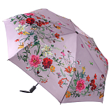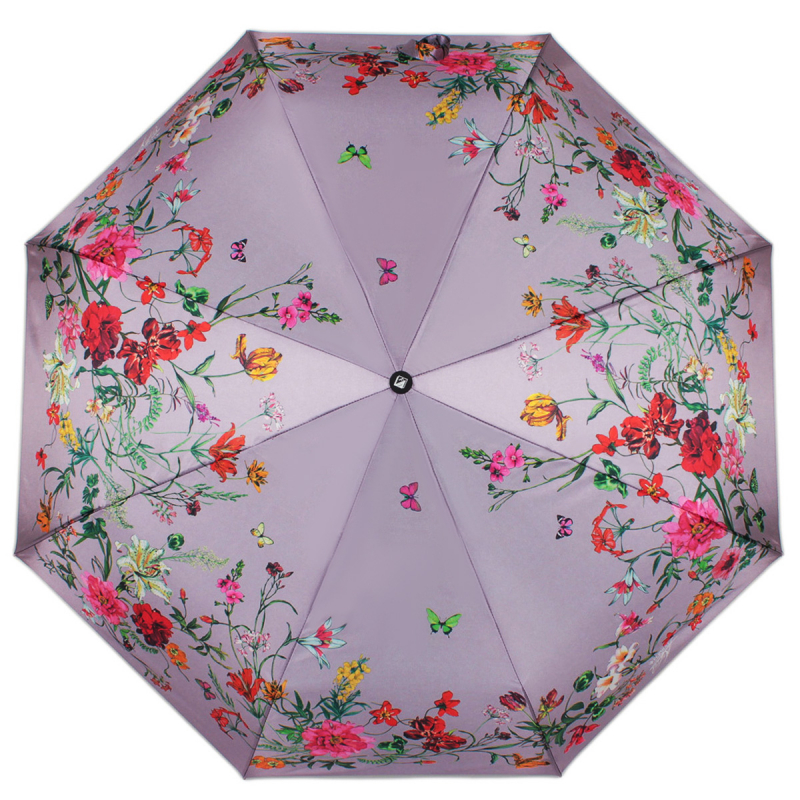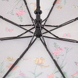 Светло-серый женский зонт «Нежность» дизайнерской коллекции. Полуавтомат, три сложения, каркас из анодированной стали, восемь карбоновых спиц, диаметр купола 116 см, прорезиненная прямая ручка с покрытием Soft-touch и петлёй на запястье. Вес 450 грамм.